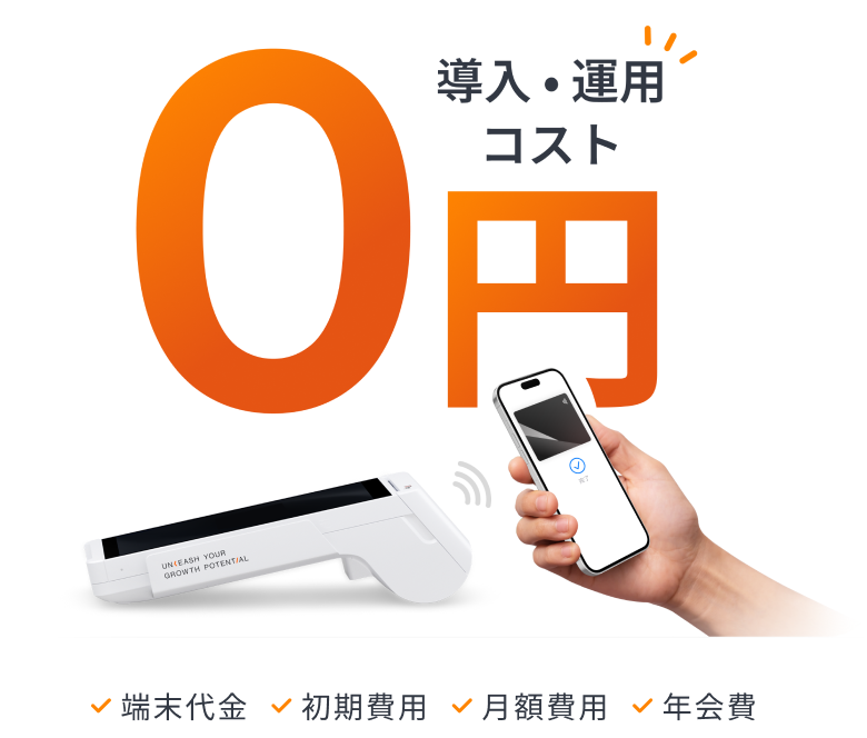 端末代、月額利用料、振込手数料、そしてロール紙代* まで全て無料!キャシュレス決済導入のハードルを無くしました。