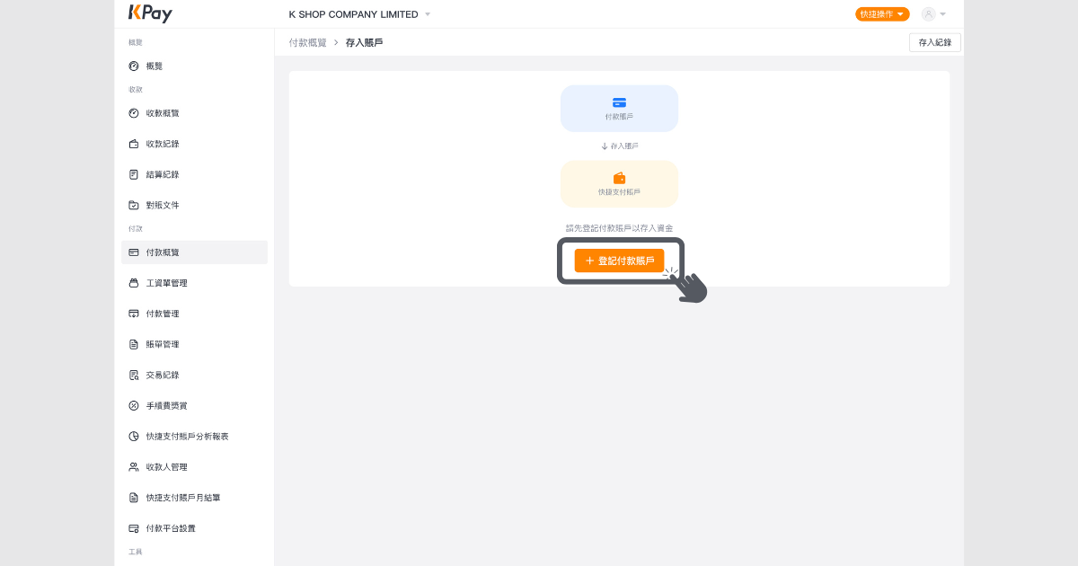 步驟1:登入收付款管理平台前往「付款」頁面,在快捷支付賬戶總覽中,按「存入」。