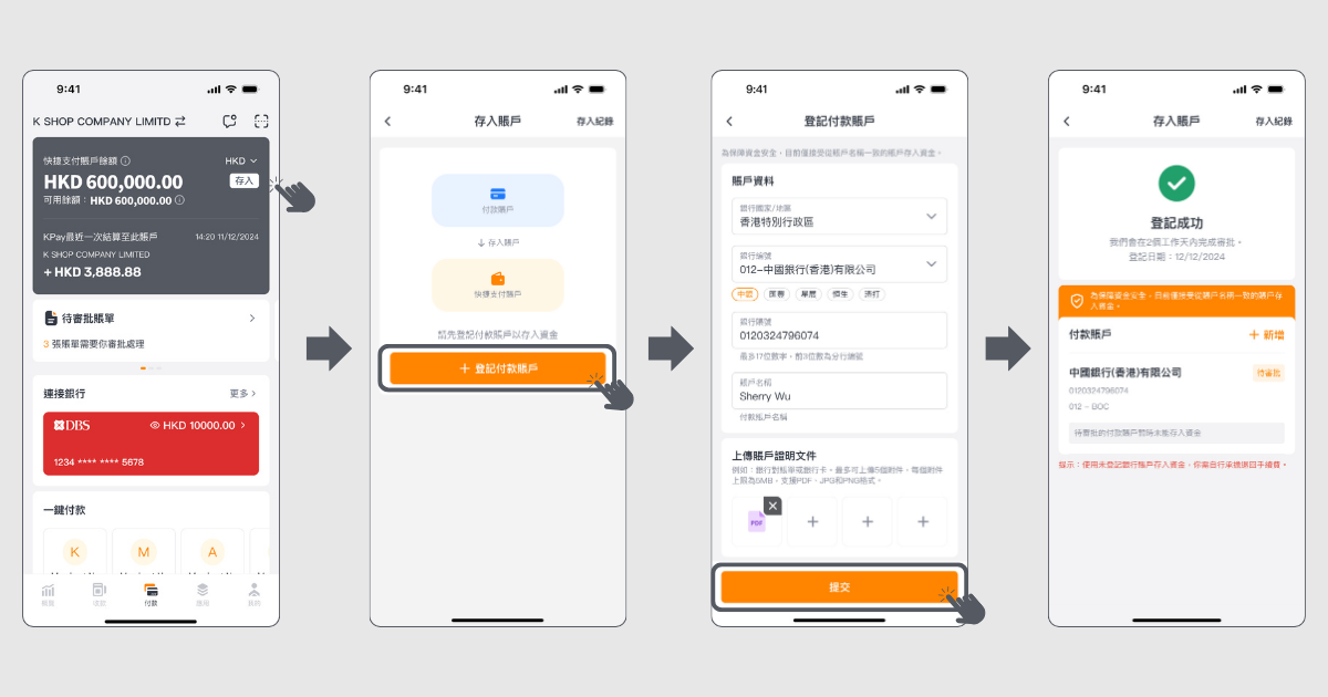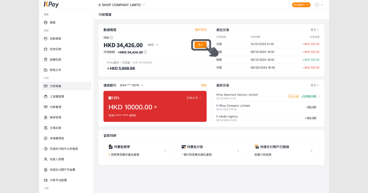 KPay 商業賬戶的存入功能,讓你可以隨時從其他銀行賬戶存入資金至KPay 商業賬戶,確保賬戶餘額充足,輕鬆完成所有付款交易。無論是支付本地賬單、供應商訂單、海外匯款還是員工發薪,你都能靈活處理交易,不受餘額限制!