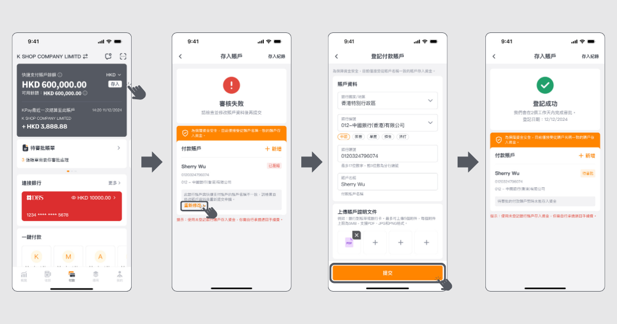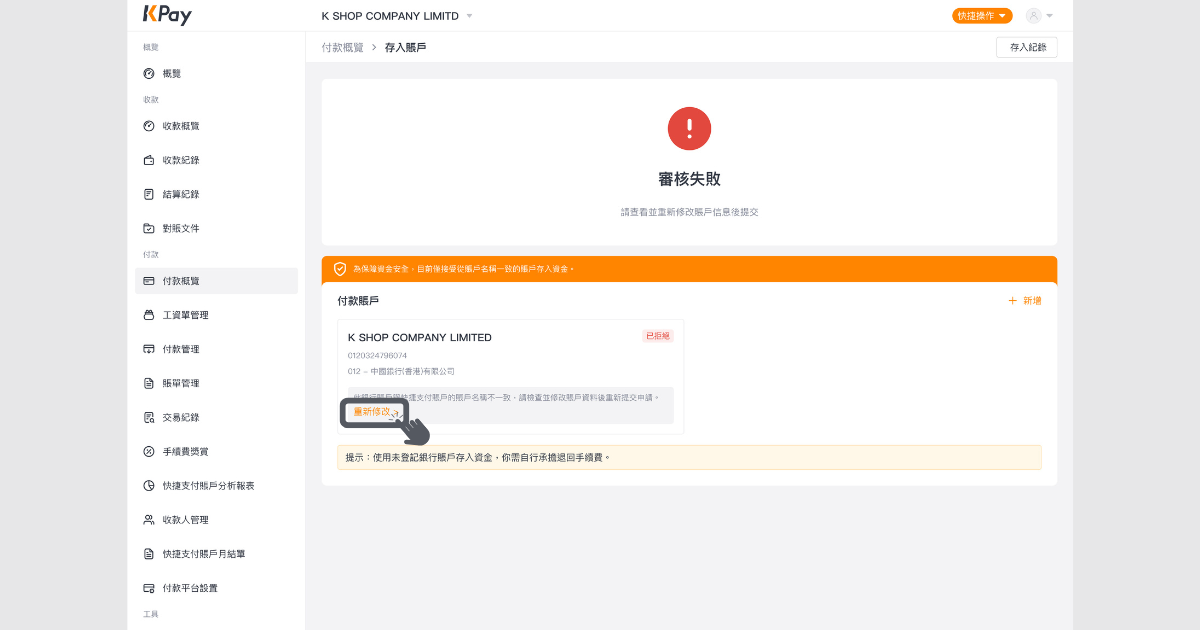步驟2:假如付款賬戶登記失敗,畫面會顯示「審批失敗」,請根據審核訊息中的指示,修改資料後再次提交賬戶登記申請。