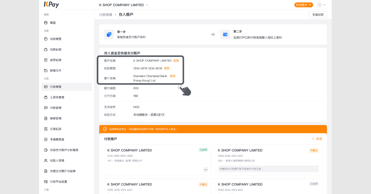 步驟2:複製KPay 商業賬戶資料並在銀行戶口的轉賬頁面輸入或貼上資料,然後轉賬至KPay 商業賬戶。