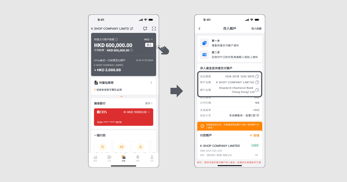 步驟2:複製KPay 商業賬戶資料並在銀行戶口的轉賬頁面輸入或貼上資料,然後轉賬至KPay 商業賬戶便可。